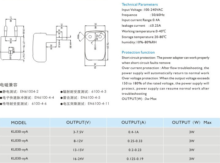 頻率:50/60Hz 輸入電流:0.4A 漏電電流:≤0.25A 工作溫度:0-40℃ 貯藏溫度:-20-80℃ 濕度:10%-80%RH 短路保護: 電源適配器在短路解除時能正常工作恢復(fù) 過流保護:過流故障排除后,電源將自動恢復(fù)正常工作 過壓保護:當(dāng)輸出電壓超過額定電壓的150-180%時,電源將保護,故障排除后電源能恢復(fù)正常工作" />