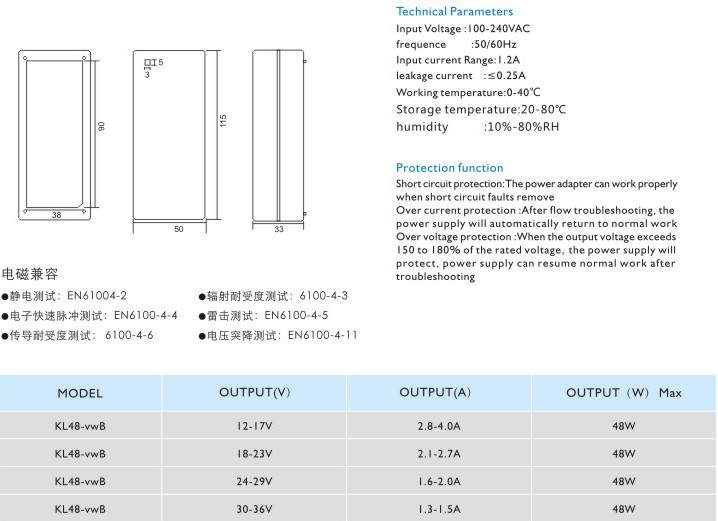過流保護(hù):過流故障排除后,電源將自動(dòng)恢復(fù)正常工作 過壓保護(hù):當(dāng)輸出電壓超過額定電壓的150~180%時(shí),電源將保護(hù),故障排除后電源能恢復(fù)正常工作 輸入電壓:100-240VAC 頻率:50/60Hz 輸入電流:1.2A 漏電電流:<0.25A 工作溫度:0-40℃ 貯藏溫度:-20-80℃ 濕度:10%-80%RH" />