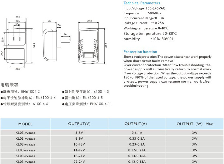 頻率:50/60Hz 輸入電流:0.13A 漏電電流:≤0.25A 工作溫度:0-40℃ 貯藏溫度:-20-80℃ 濕度:10%-80%RH 短路保護(hù): 電源適配器在短路解除時能正常工作恢復(fù) 過流保護(hù):過流故障排除后,電源將自動恢復(fù)正常工作 過壓保護(hù):當(dāng)輸出電壓超過額定電壓的150-180%時,電源將保護(hù),故障排除后電源能恢復(fù)正常工作" />