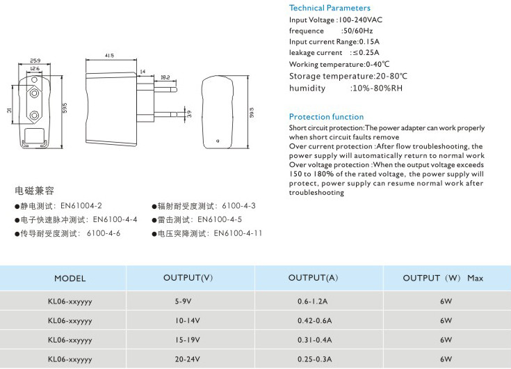 頻率:50/60Hz 輸入電流:0.15A 漏電電流:≤0.25A 工作溫度:0-40℃ 貯藏溫度:-20-80℃ 濕度:10%-80%RH 短路保護(hù): 電源適配器在短路解除時(shí)能正常工作恢復(fù) 過流保護(hù):過流故障排除后,電源將自動(dòng)恢復(fù)正常工作 過壓保護(hù):當(dāng)輸出電壓超過額定電壓的150-180%時(shí),電源將保護(hù),故障排除后電源能恢復(fù)正常工作" />
